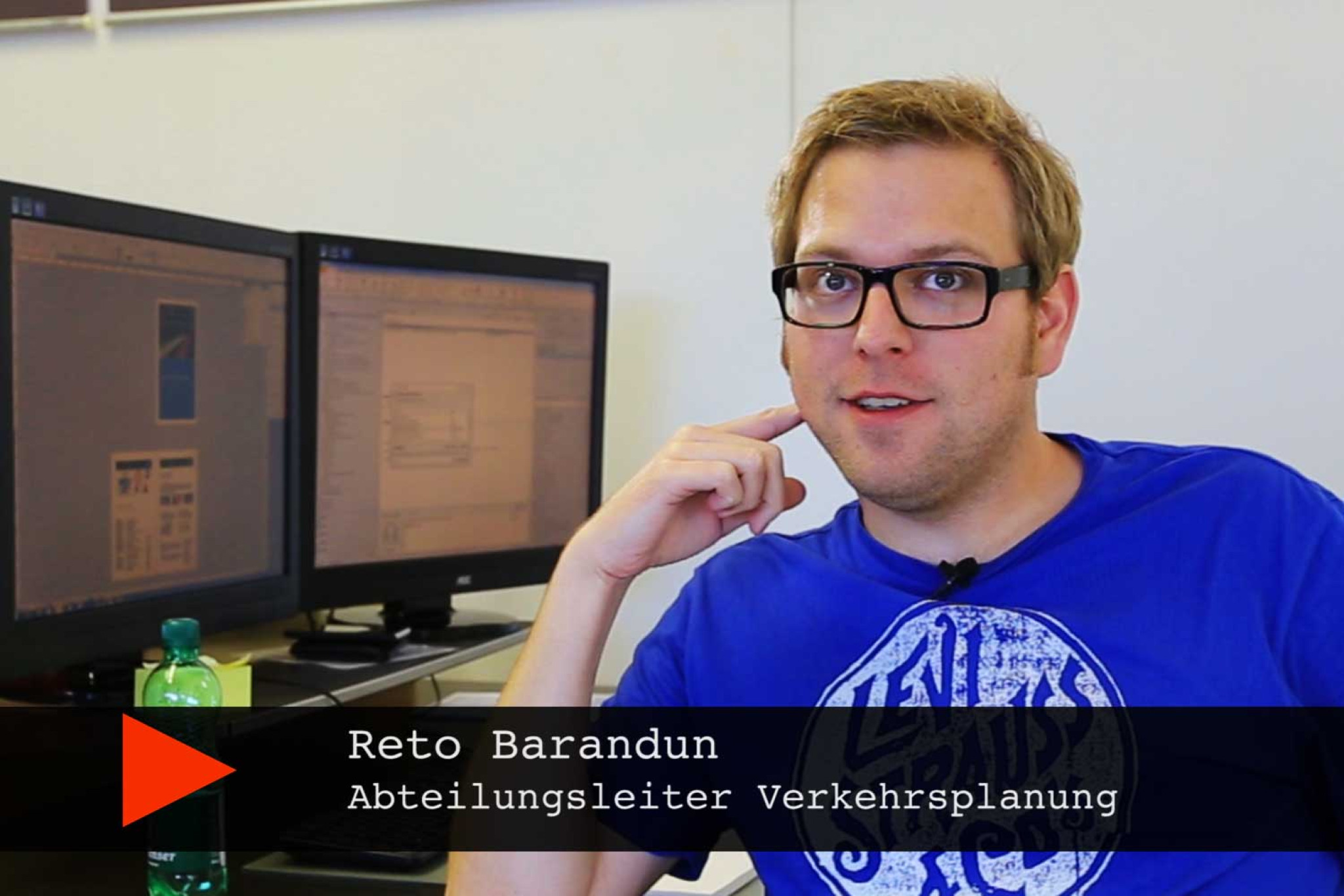 Reto Barandun, 29 ans, vit à Coire et dirige le département Planification des transports chez HMQ AG. Il travaille également comme chef de projet dans les départements Aménagement du territoire et Construction (voir à ce sujet la vidéo « Inside HMQ : Reto Barandun »).