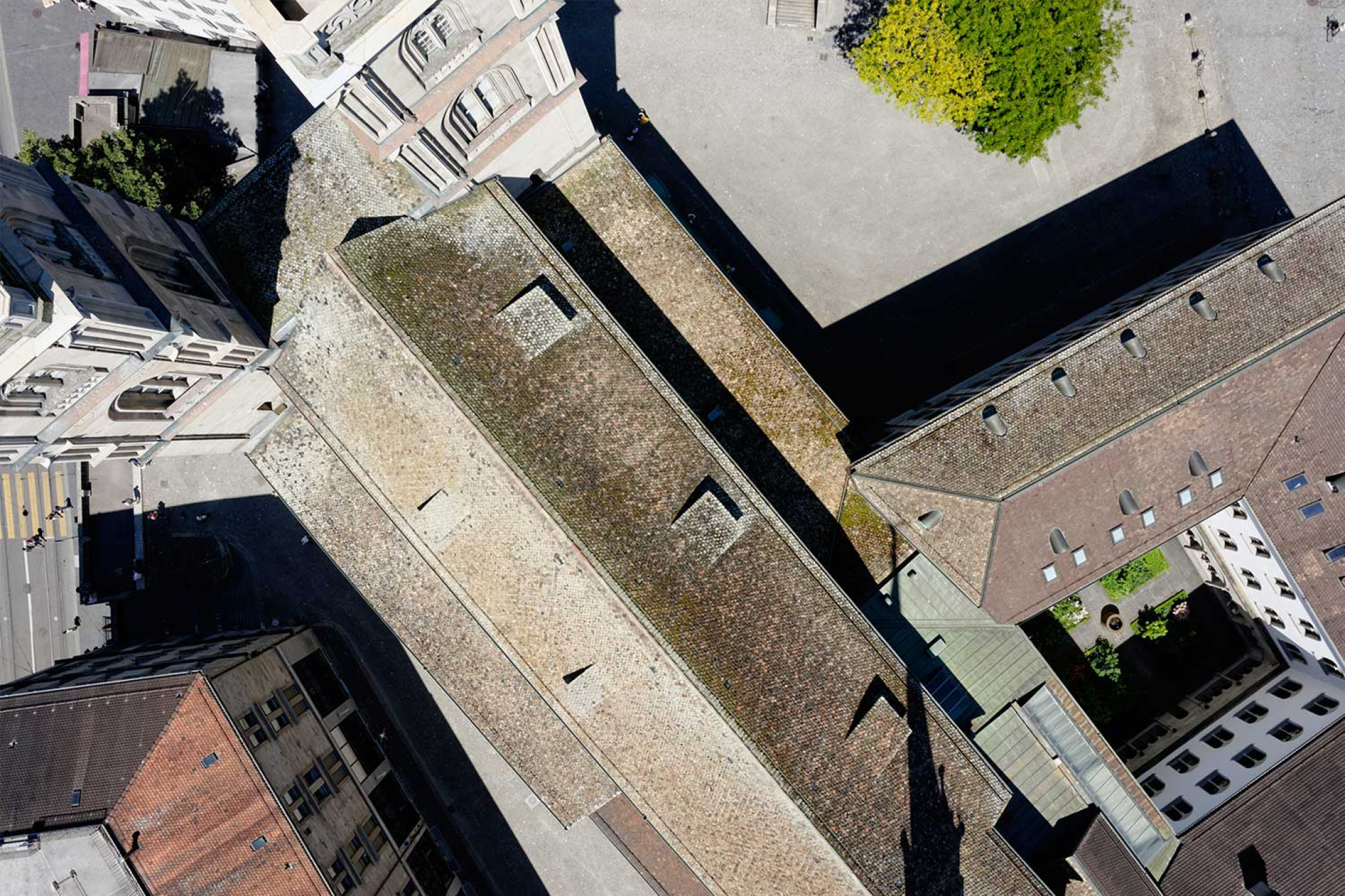 Les façades du Grossmünster ont été photographiées non seulement en raison de leur taille, mais aussi en raison des exigences. À partir des photos aériennes, HMQ AG a utilisé la photogrammétrie pour créer des orthophotos photoréalistes et haute résolution des façades avec une résolution d'image de 5 mm. Les orthophotos ont ainsi servi de base à une évaluation précise des façades.