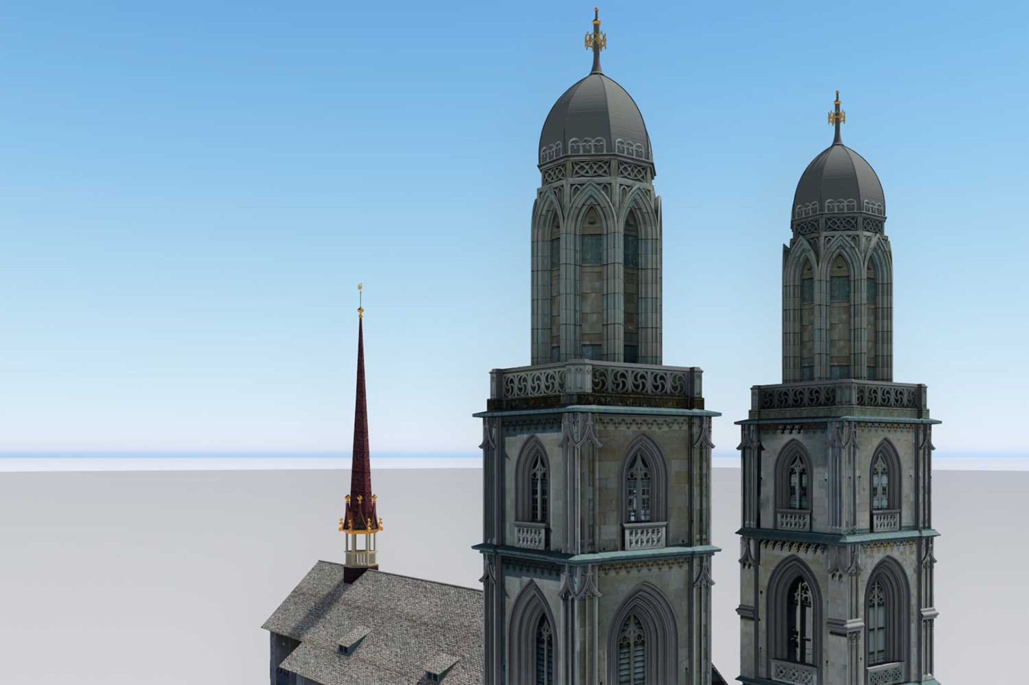 Le Grossmünster est sans doute l'église la plus célèbre de la ville de Zurich. Ses deux tours caractéristiques sont l'emblème même de la ville. HMQ AG a entièrement documenté le Grossmünster en 3D à l'aide d'un scanner laser, avec plus de 1 000 points de scan.