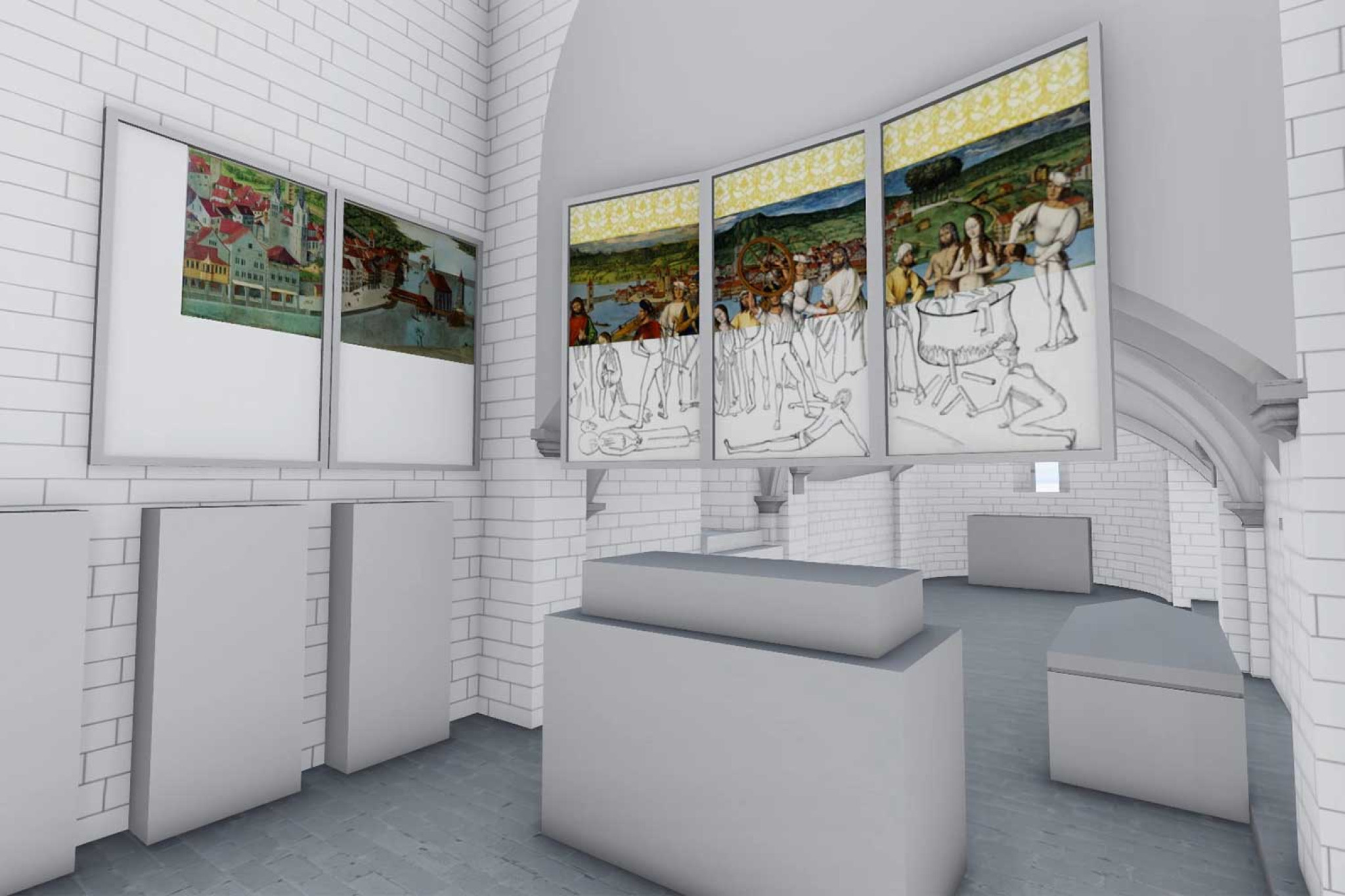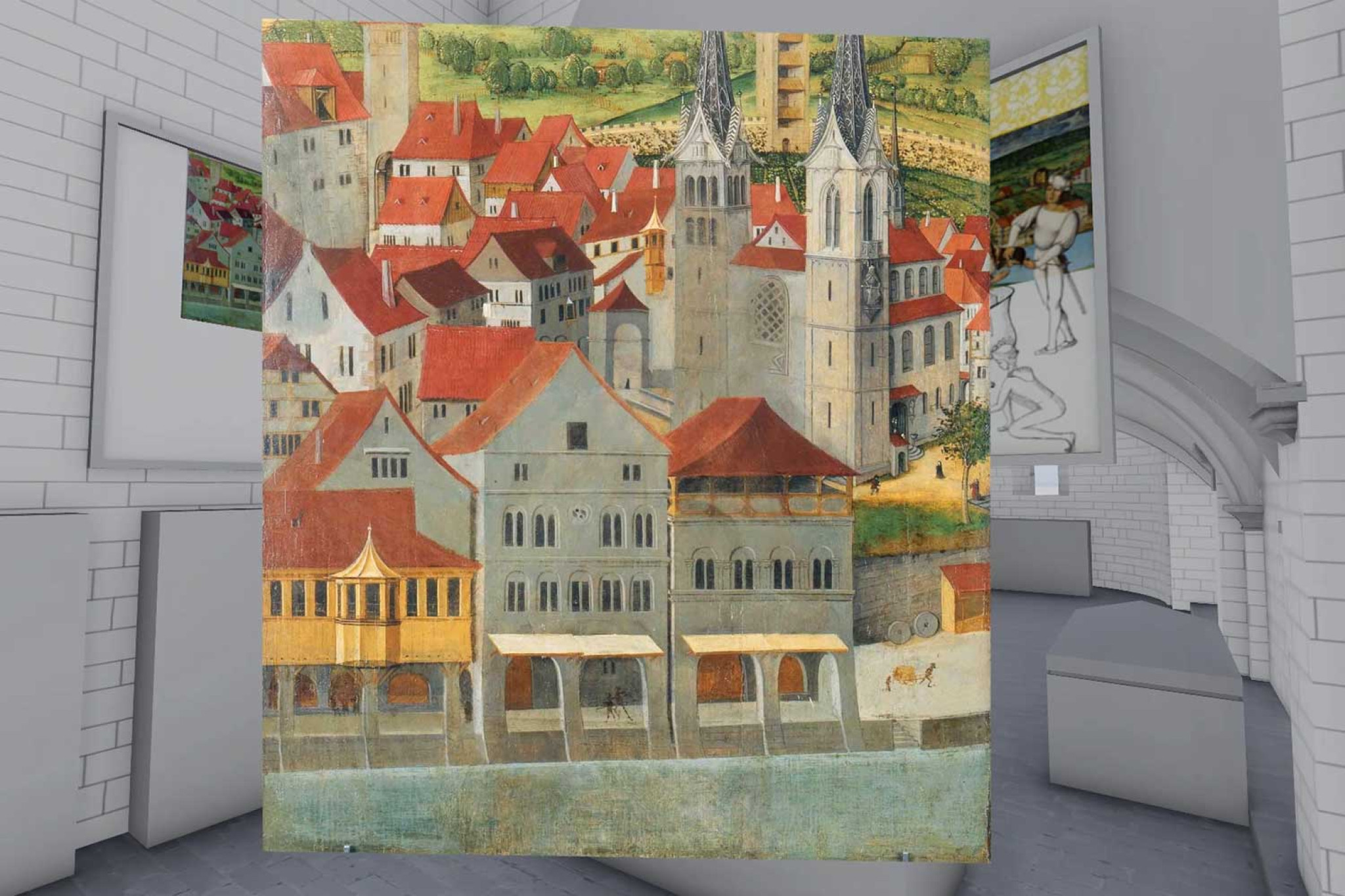 Les préparatifs en vue de l'exécution de Félix et Régule sont représentés sur les panneaux illustrant la ville sur la rive gauche de la Limmat. Les saints sont à nouveau visibles ici, car ils ont été mis au jour lors de travaux de restauration au XXe siècle.