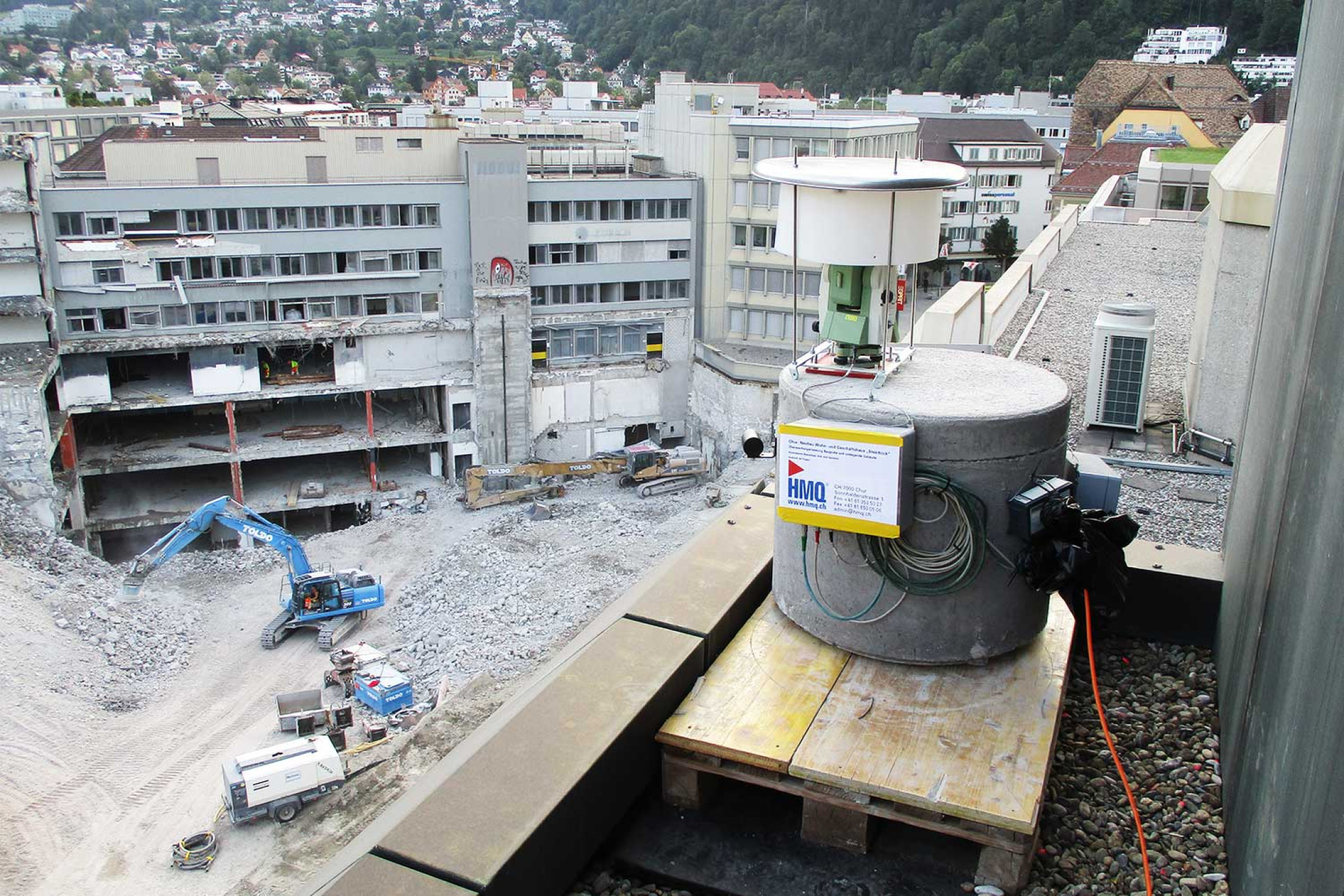 Selon les besoins, différents capteurs sont utilisés, tels que des tachéomètres de précision, des inclinomètres, des extensomètres, des niveaux à bulle, des vibromètres ou encore des combinaisons de différents capteurs. « Le monitoring GNSS, en particulier, fournit des résultats de très haute qualité pour les projets exigeants », explique Christian Vetsch, directeur général de HMQ. Cela est rendu possible non seulement par la dernière génération de technologie utilisée par HMQ AG, mais aussi par un procédé d'évaluation numérique extrêmement performant offrant une précision sans précédent. Cela est notamment possible parce que les appareils utilisent de manière équivalente tous les systèmes satellitaires disponibles. « Lorsque les exigences de précision sont élevées, nous pouvons encore augmenter la précision à l'aide d'une station de référence locale », explique l'ingénieur géomètre.