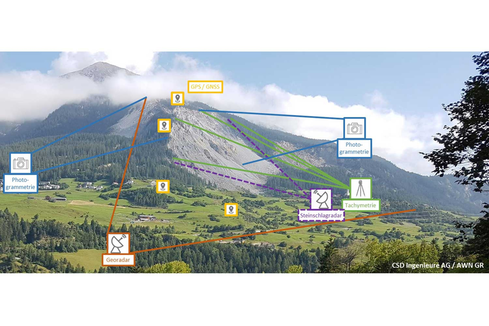 Une grande partie des données de mesure utilisées pour évaluer la situation a été fournie par l'équipe de géomatique de HMQ. « Pour observer la situation avec précision, plusieurs systèmes doivent fonctionner ensemble », explique Christian Vetsch, directeur général de HMQ Geomatik. HMQ est responsable de la surveillance géodésique de nombreux points individuels répartis sur la zone de glissement. Des tachéomètres et des capteurs GNSS sont utilisés pour collecter ces données :