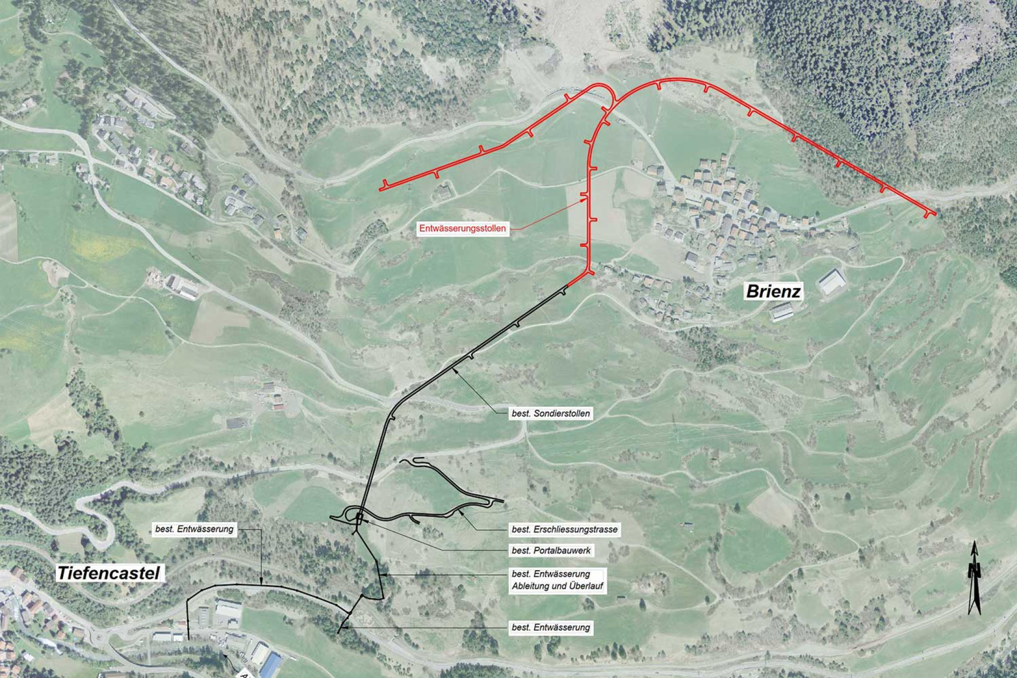 Au printemps 2024, l'extension de la galerie de sondage débutera donc par la construction d'une galerie de drainage de 1666 m de long sous le glissement de terrain. De nombreux forages de drainage permettront de réduire considérablement la pression interstitielle de la couche de glissement sous Brienz. L'objectif est de réduire les mouvements du village à moins de 10 cm par an grâce au drainage. Cela permettra d'une part de préserver le village et d'autre part de sécuriser la liaison ferroviaire et routière ainsi que la ligne à haute tension passant par le col de l'Albula.