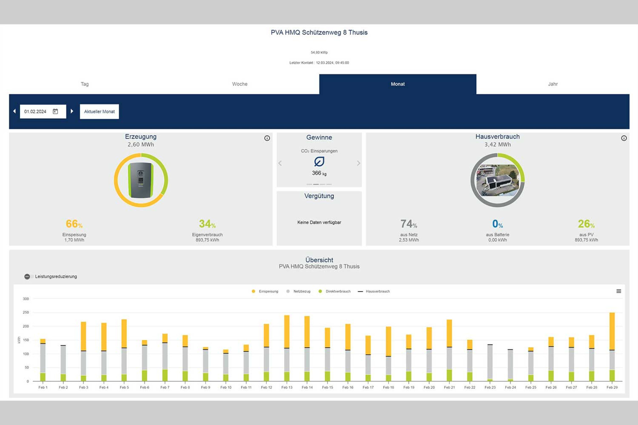 Le rendement annuel dépasse la consommation annuelle du bâtiment d'environ 20 %. Le bâtiment situé à Schützenweg, à Thusis, est ainsi devenu une maison à énergie positive. L'électricité excédentaire est injectée dans le réseau. Avec cette installation photovoltaïque, HMQ AG démontre une fois de plus ce que signifie concrètement l'entrepreneuriat durable.